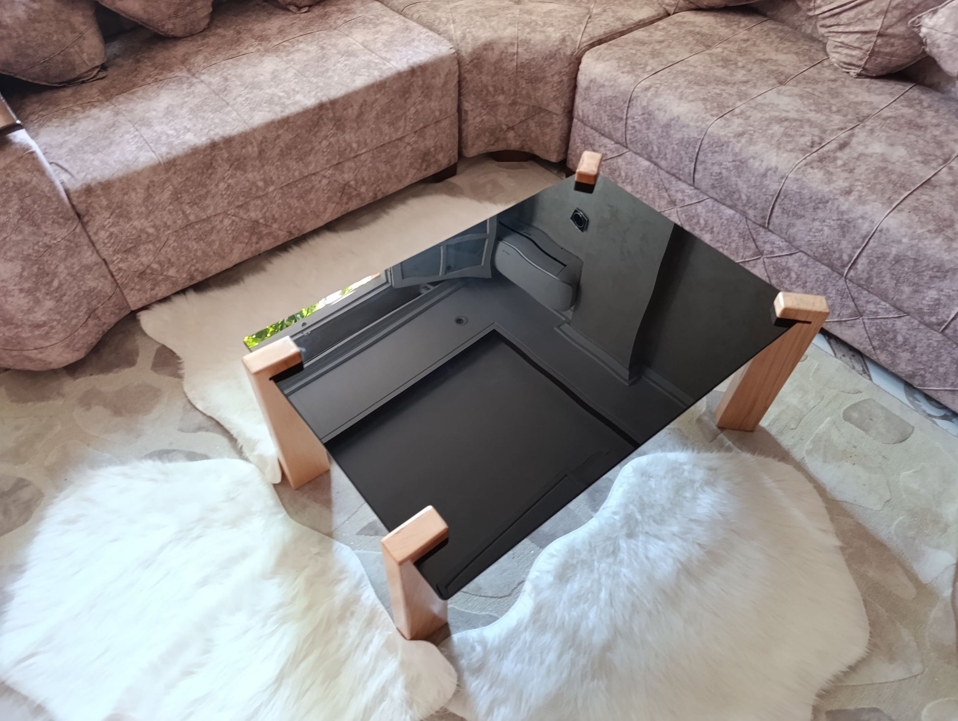 🖤 طاولة زجاج أسود فاخرة بأرجل خشب الزان – قطعة مركزية تعيد تعريف أناقة مساحتك